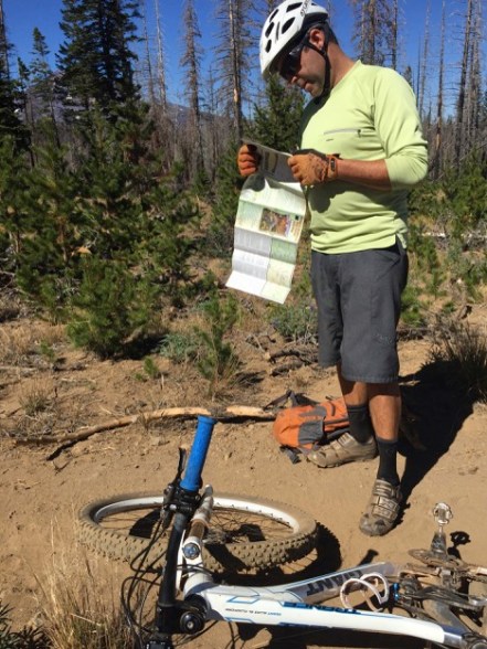 It. Was. Beautiful. Flowing single-ish track (a bit wider perhaps). The occasional fun root section, not much up, not much down. Waterfalls. Big trees. And a whole-lotta people. We passed only one other biker – he was on his way out and said to us, a bit too loudly, “It’s not worth it. There’s just too many people.” Determined, we carried on and soon came to a bridge, followed by a creek, and then a waterfall. Hmmmm…things were getting good. With icy water up to mid-calves, we crossed the creek and headed up to a trail junction. (Be sure and bring your maps and directions, folks. We left ours safely in the car and had to snap a photo of one courtesy of a friendly hiker.) Just a handful of miles into the ride, and the crowds had entirely disappeared. Now, this is what we’re talking about.