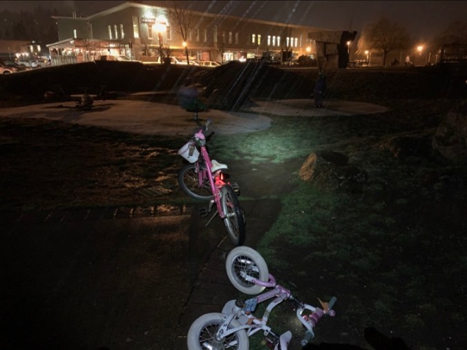 I don’t know what the hell they were thinking, but the girls decided they wanted to go ride their bikes – in the dark, and the cold, while. It. Was. Snowing. I’m serious. And so they ask me to go do this and of course I’m thinking “no f-ing way.” Because, did I mention, it was cold, dark, and snowing?!@*#! But shit, when your kids come to you in full snow gear, headlamps in hand, helmets on, what else can you say, but “okay. Let’s go!”